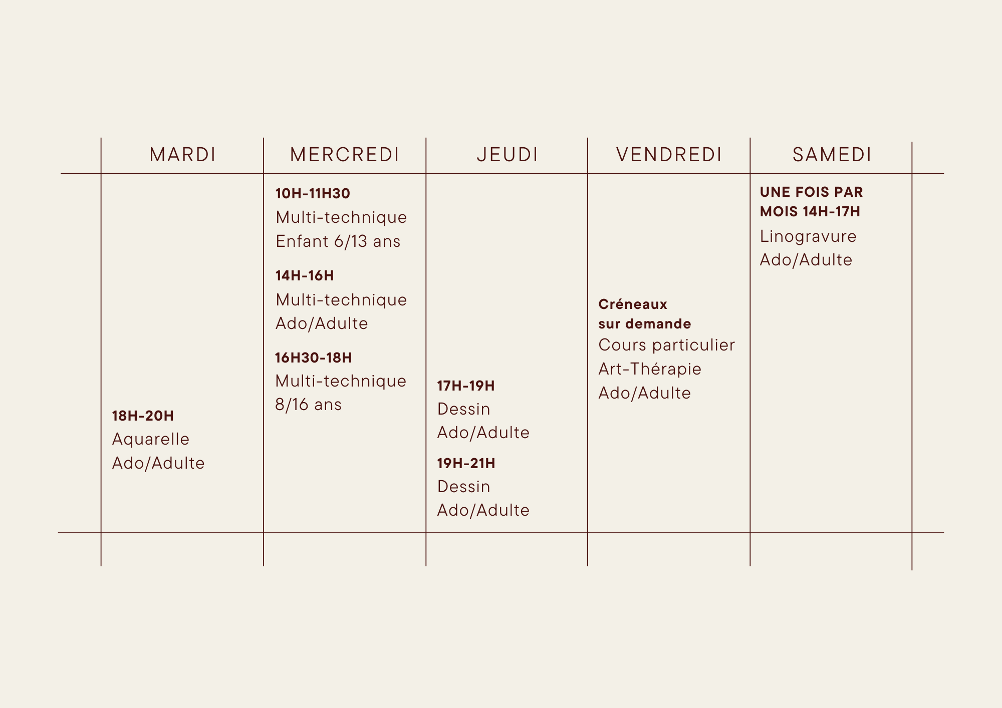 Pour nos plus petits, dès 5 ans, Léa et Félicia s’occuperont de vos enfants pendant 1h30 pour émerveiller les sens. Peinture, dessin, collage, pastel, acrylique, aquarelle, POSCA… toutes les techniques sont réunis pour créer tout au long de l’année.